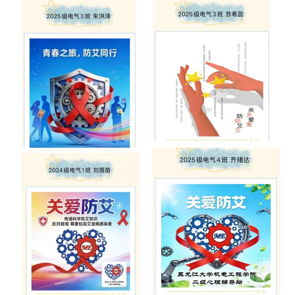 为进—步普及艾滋病防治知识,打破认知误区与歧视偏见,凝聚青年群体对防艾工作的关注与担当,机电工程学院“心氧吧”二级心理辅导站开展了青春之旅,关爱防“艾”——主题海报征集活动。此次海报征集活动,不仅让防艾知识以更具创意的形式走进青年群体,更让机电专业特色与防艾的人文关怀碰撞出独特火花,展现了机电学子的社会责任与创意才华。