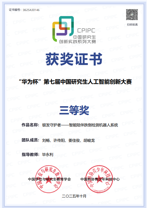 近日,由教育部学位管理与研究生教育司指导,中国学位与研究生教育学会和中国科协青少年科技中心共同主办,中国海洋大学承办的“华为杯”第七届中国研究生人工智能创新大赛全国总决赛在青岛落幕。机电工程学院毕永利教授课题团队的刘畅、许传阳、姜佳俊、胡峻龙作品《银发守护者——智能陪伴跌倒检测机器人系统》荣获全国三等奖。
