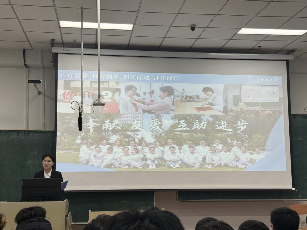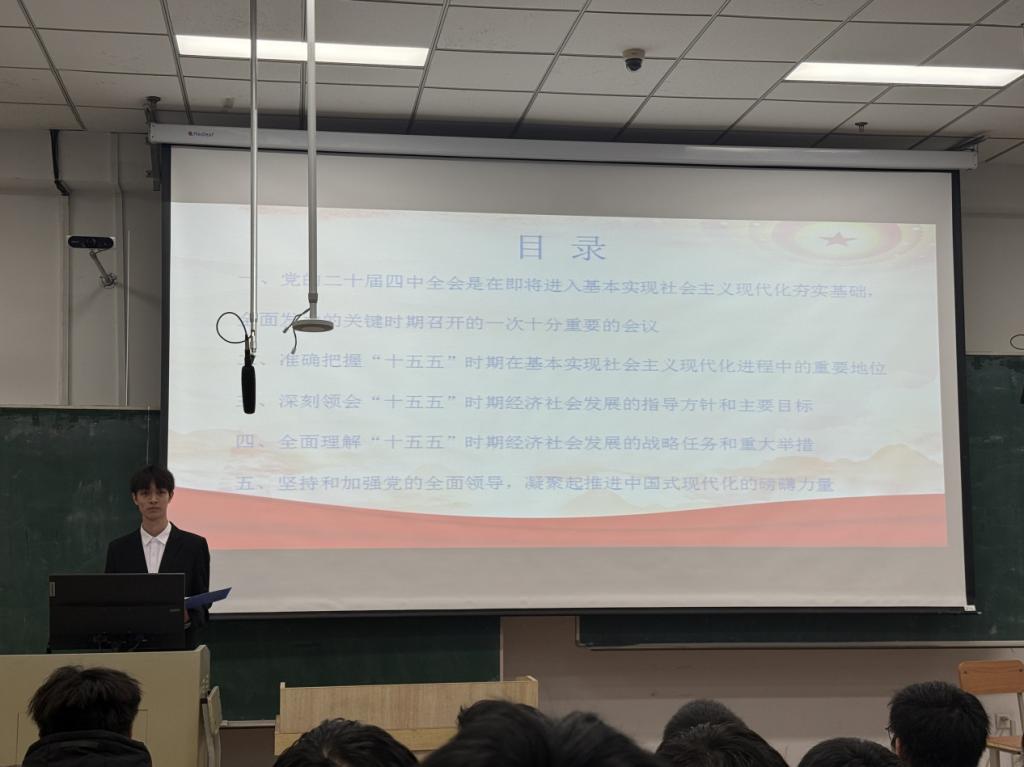 为深入学习贯彻党的二十届四中全会精神,推动党的创新理论在青年学生中入脑入心、落地生根,引导广大青年深刻领悟“两个确立”的决定性意义,增强“四个意识”、坚定“四个自信”、做到“两个维护”,自觉把个人理想融入中国式现代化建设中,机电工程学院诚邀校青年学生理论宣讲团于12月6日在汇文楼180教室开展宣讲活动,本次宣讲由学院2023级本科生祁琪主持,学院团委副书记栾义豪及2025级全体本科生参加会议。