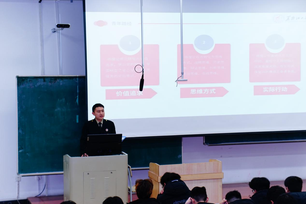 哲学学院唐旭以《以思想伟力驱动时代,用理论创新导航征程》为题进行宣讲,他结合自己在部队服役的经历,激励同学们坚定理想信念,倡导当代青年应将个人理想与国家命运紧密相连,用实际行动书写青年的壮丽篇章。